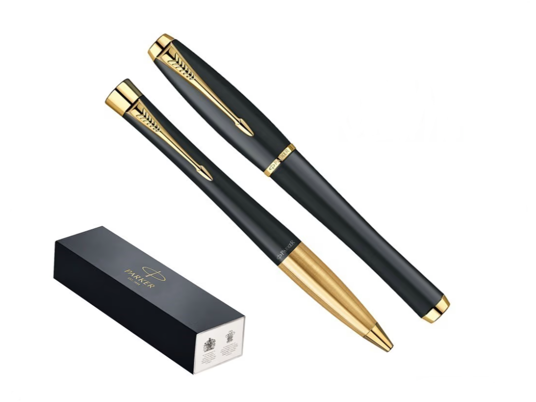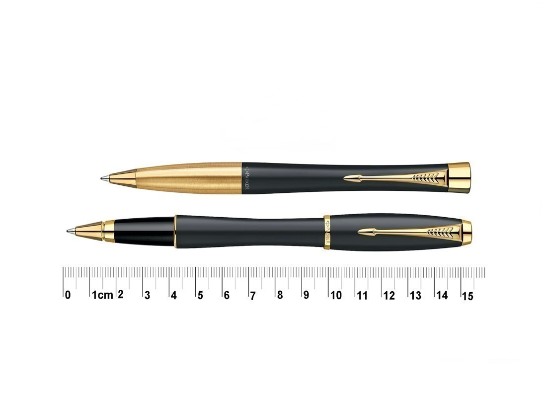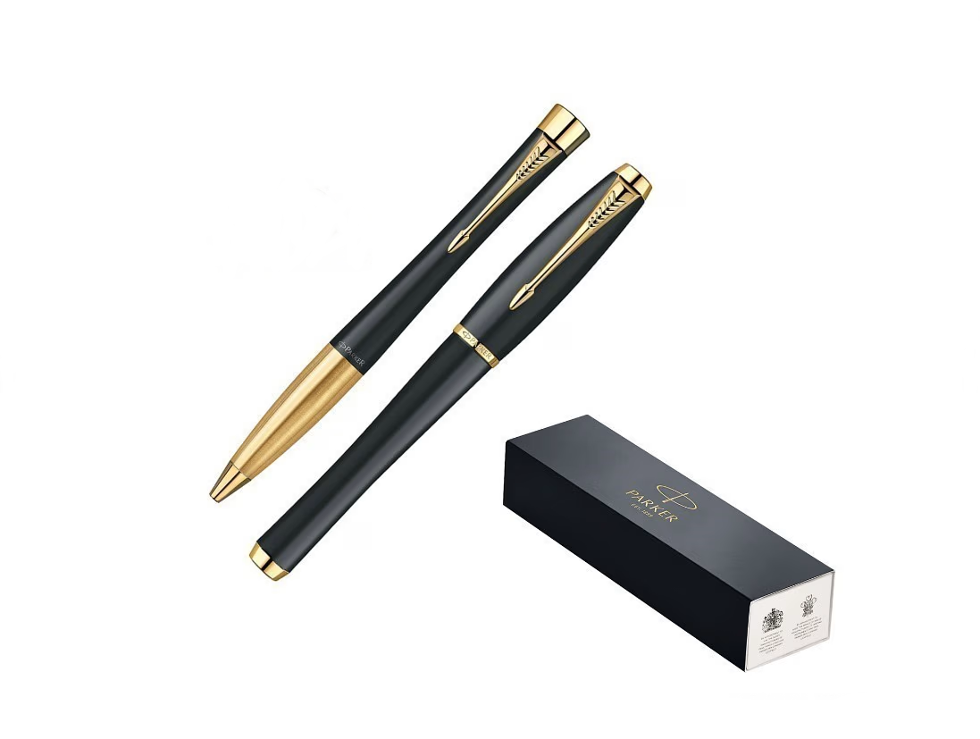 - Muted Black with Gold Trim Finish Luxury Gift Set Urban Ballpoint and Rollerball Medium Point Nib Black Ink by Parker in gift box.
