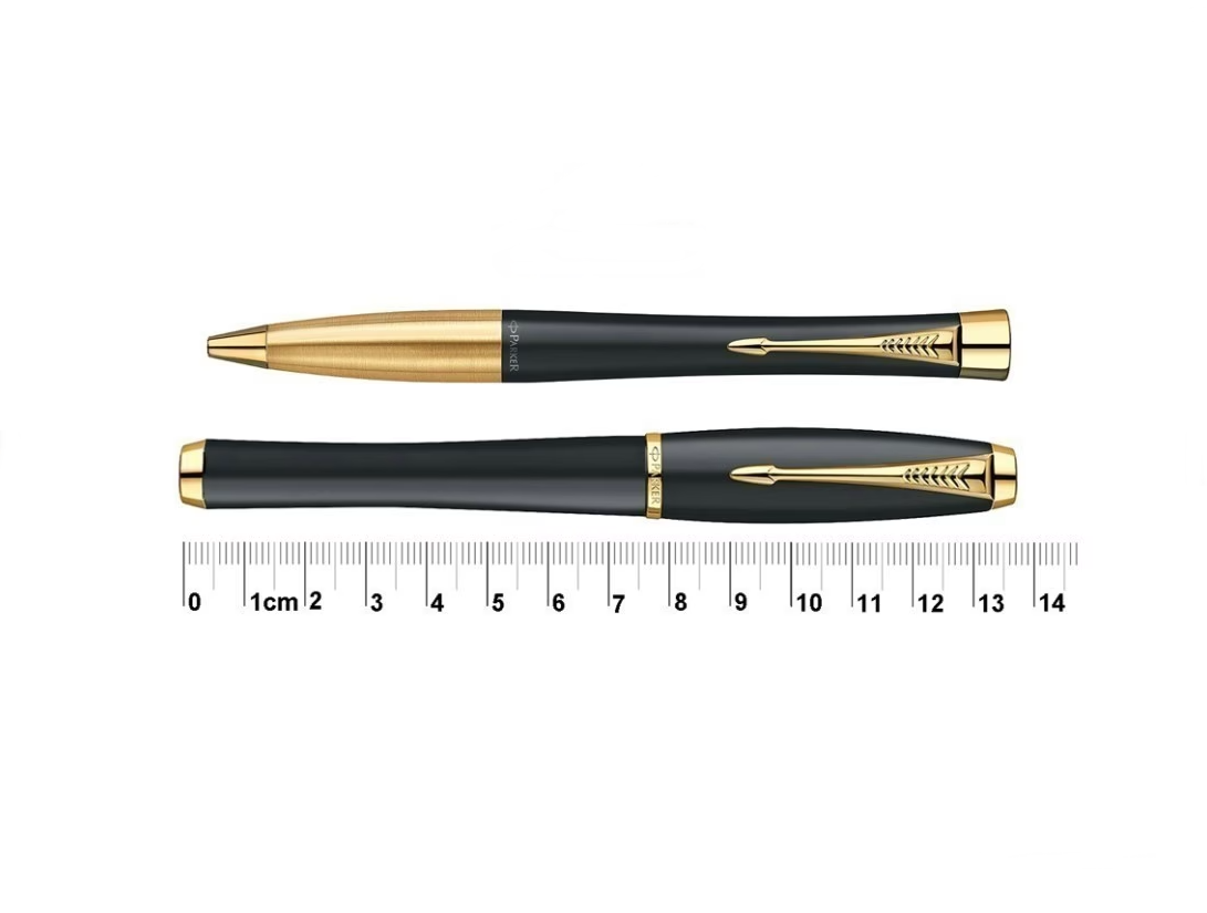 1-One Muted Black with Gold Trim Finish Urban Rollerball Pen Parker – Medium Nib Black Ink included Parker 3021331 Quink Refill Ink In Black (Width 0.59 inches / 15mm),(Length: 5.43 inches / 138mm),(Weight: 1.26 oz / 36g), (Material – Brass, Muted Black with Gold Trim Finish),(The Finish – Muted Black complemented with Gold + Polished finish)